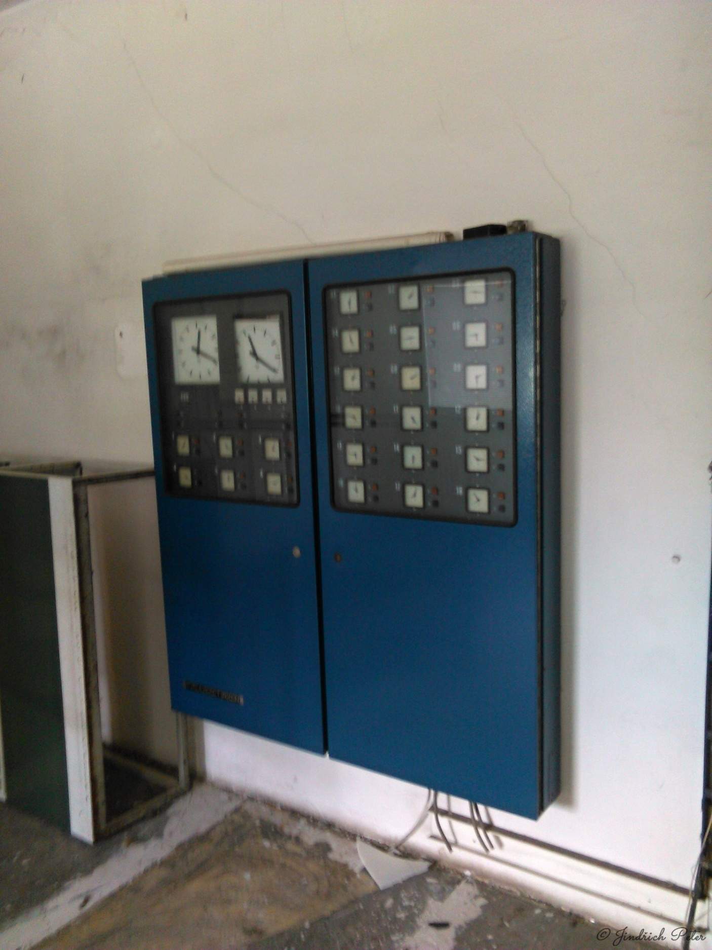 Ústředna vestavěná do krabice KT 250,která je vybavena kabelovými průchodkami pro připojení napájecího napětí,linek podružných hodin.